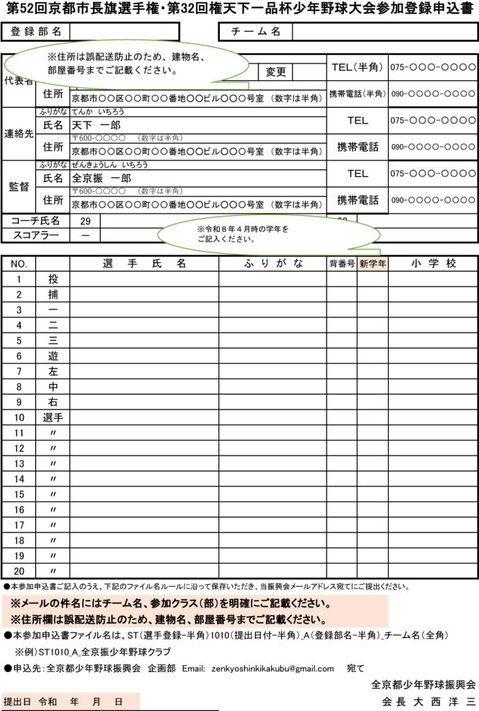 第52回京都市長旗選手権・第32回天下一品杯少年野球大会参加登録申込書 (エクセル形式)を前大会のものでの流用はしないようお願い致します。