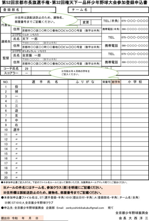 第52回京都市長旗選手権・第32回天下一品杯少年野球大会参加登録申込書 (エクセル形式)を前大会のものでの流用はしないようお願い致します。